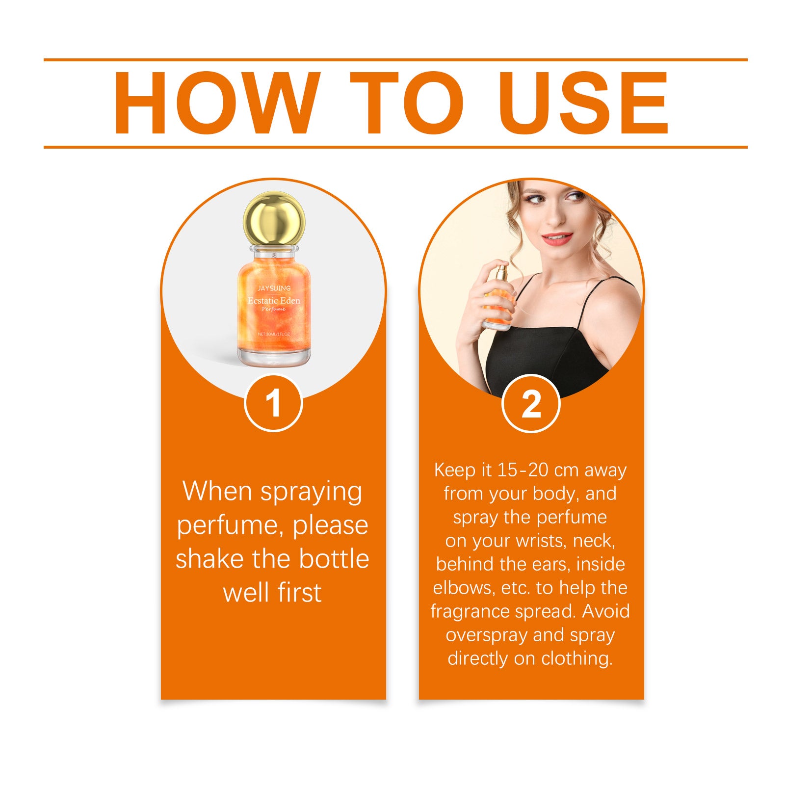 Our Revel Eden perfume contains ethanol, essence. It can it can blend perfectly, bring different senses. Its use is very simple: to apply perfume, shake the bottle, keep it 15-20 cm away from the body, and spray the perfume on the wrists, neck, behind the ears, and inside the elbow. To help the scent spread. Avoid overspraying and apply directly to clothing. And suitable for a variety of occasions, whether it is daily life business or dating, can be perfectly used.