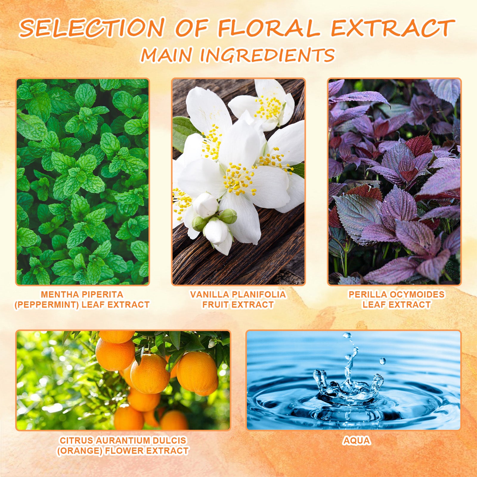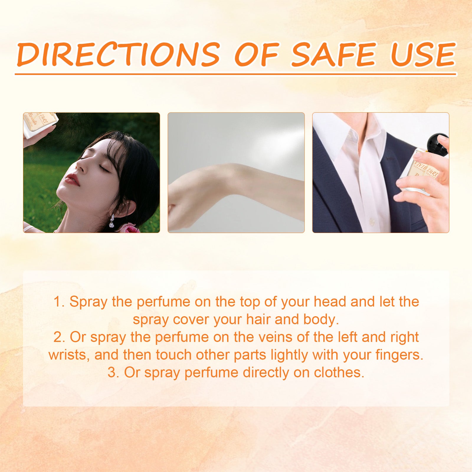 Our Dopamine Perfume contains Mentha Piperita (Peppermint)Leaf Extract, Citrus Aurantium Dulcis (Orange)Flower Extract, Vanilla Planifolia Fruit Extract. It can improve the surrounding atmosphere, create a more pleasant and comfortable environment, and enhance your personal charm. It's easy to apply: spray the perfume on top of your head and let the spray cover your hair and body, spray the perfume on your left and right wrists, then gently apply the rest with your fingers, or spray the perfume directly onto your clothes. It can boost an individual's self-confidence and help to project a more positive and confident image.